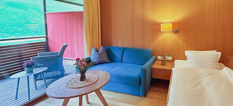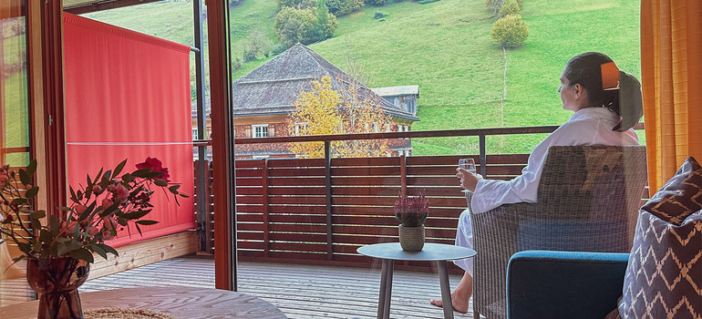 - Sauna-Wellness-Welt mit Saunen und Dampfbädern, Erlebnisduschen und Ruhebereichen mit Bergblick